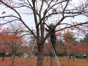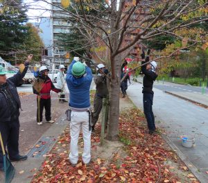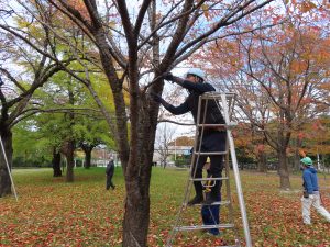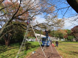 青葉分会 令和7年11月 西公園 お花見広場にて作業を行いました。 広場開設後、手入れが行われておらず枯れ枝や支障枝等が目立ち始めたので、 来年の春に安心してお花見ができるよう、桜の枯れ枝等を剪定しました。
